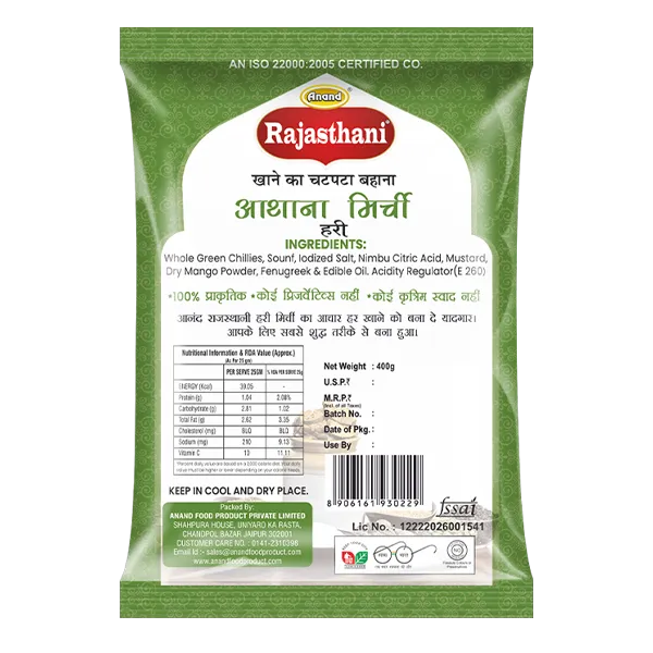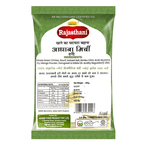 INGREDENTS : Athana Mirchi Made From Green Chilli (67%), Mustard Whole, Iodised Salt, Spices & Comdiments, Edible Vegetable Oil And Acidity Regulator (INS 260 & INS 330).