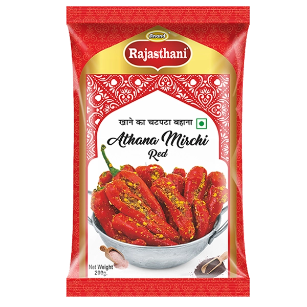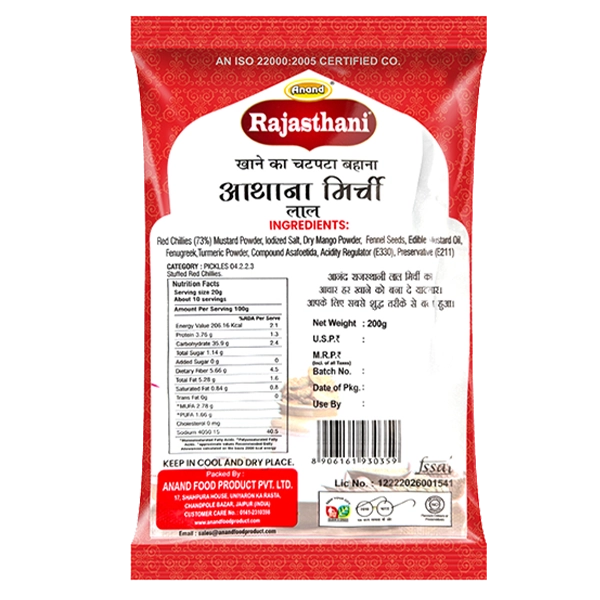 INGREDENTS : Athana Mirchi Made From Red Chilli (67%), Mustard Whole, Iodised Salt, Spices & Comdiments, Edible Vegetable Oil And Acidity Regulator (INS 260 & INS 330).